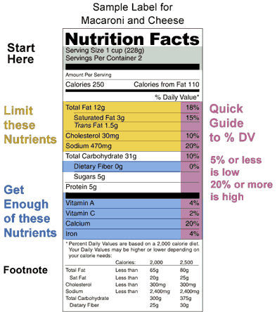 Reading food labels: Tips if you have diabetes - Mayo Clinic Look for foods with fats, cholesterol and sodium on the low end of the Daily Value; keep fiber, vitamins and minerals on the high end. If your doctor or registered dietitian recommends more or less than 2,000 calories a day, you may need to adjust the percentage accordingly — or simply use the percentage as a general frame of reference.